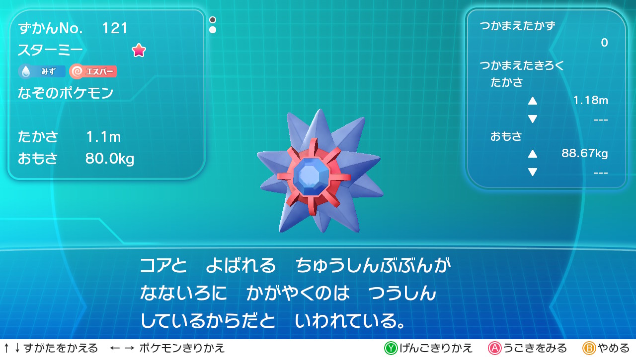 This Pokémon has an organ known as its core. The organ glows in seven colors when Starmie is unleashing its potent psychic powers. (ENG)
